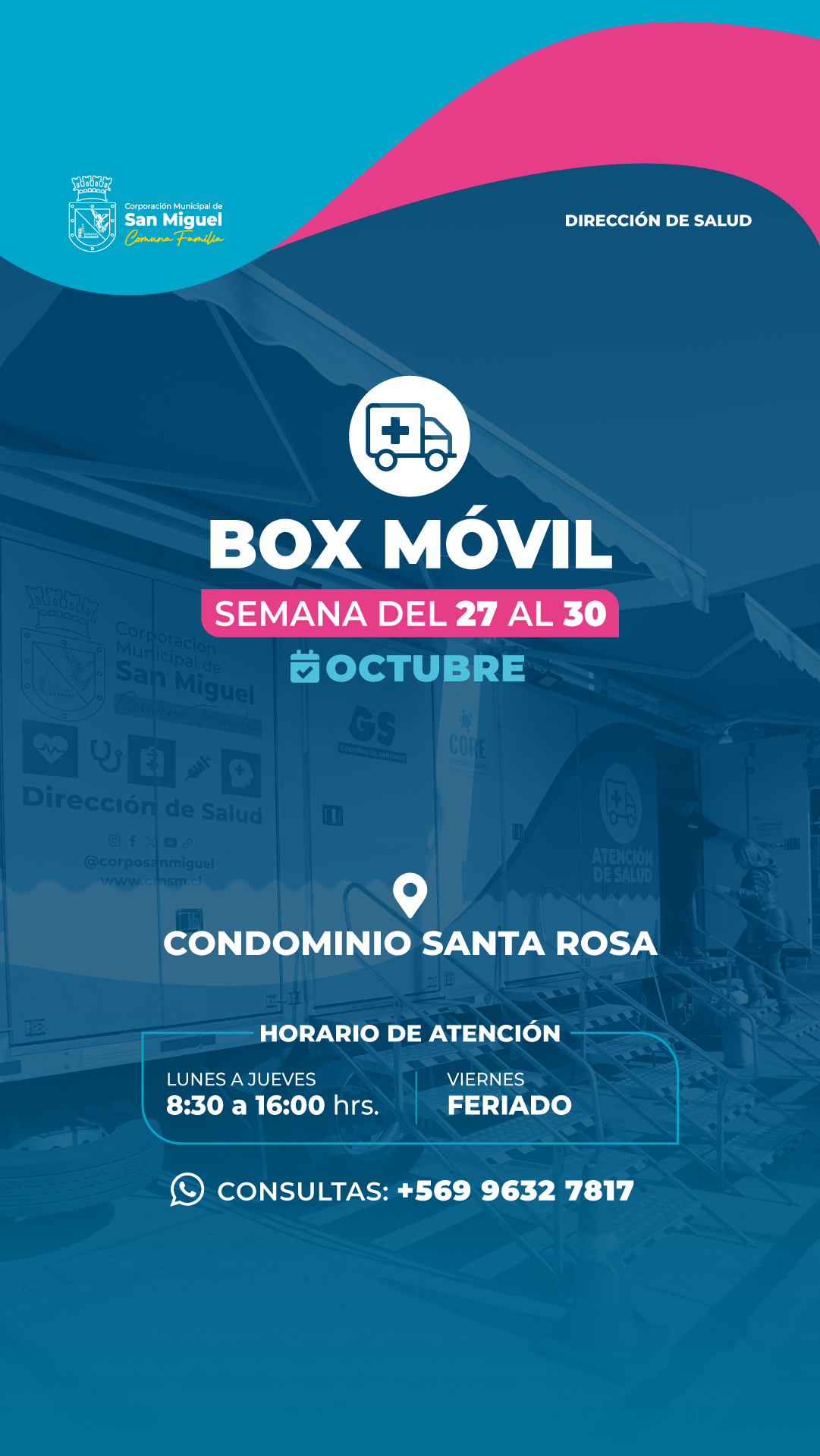 La Corporación Municipal de San Miguel, a través de su Dirección de Salud y con el compromiso de acercar la salud a todos los rincones de la comuna, informa el calendario de atención del Box Móvil para esta semana.
